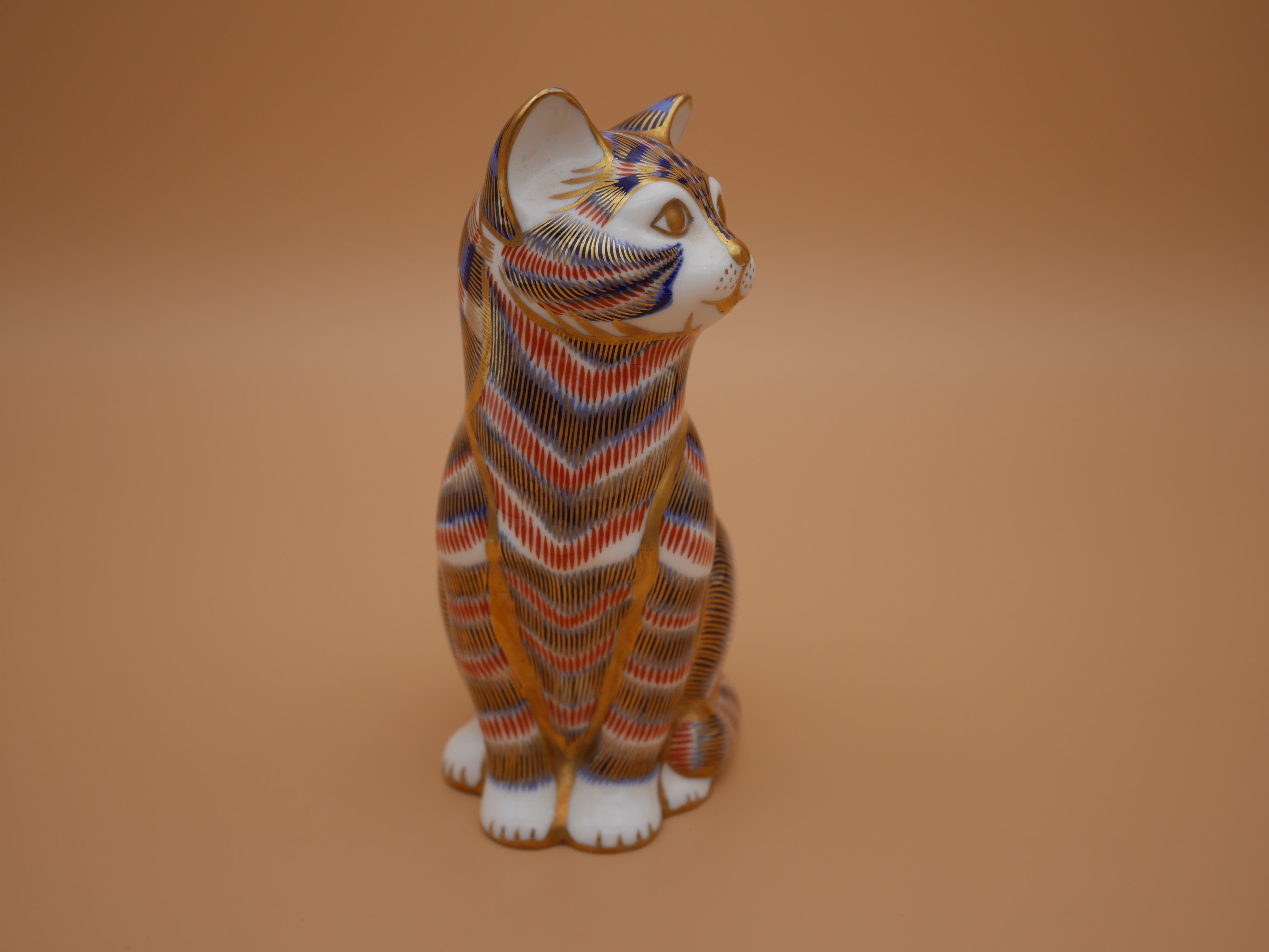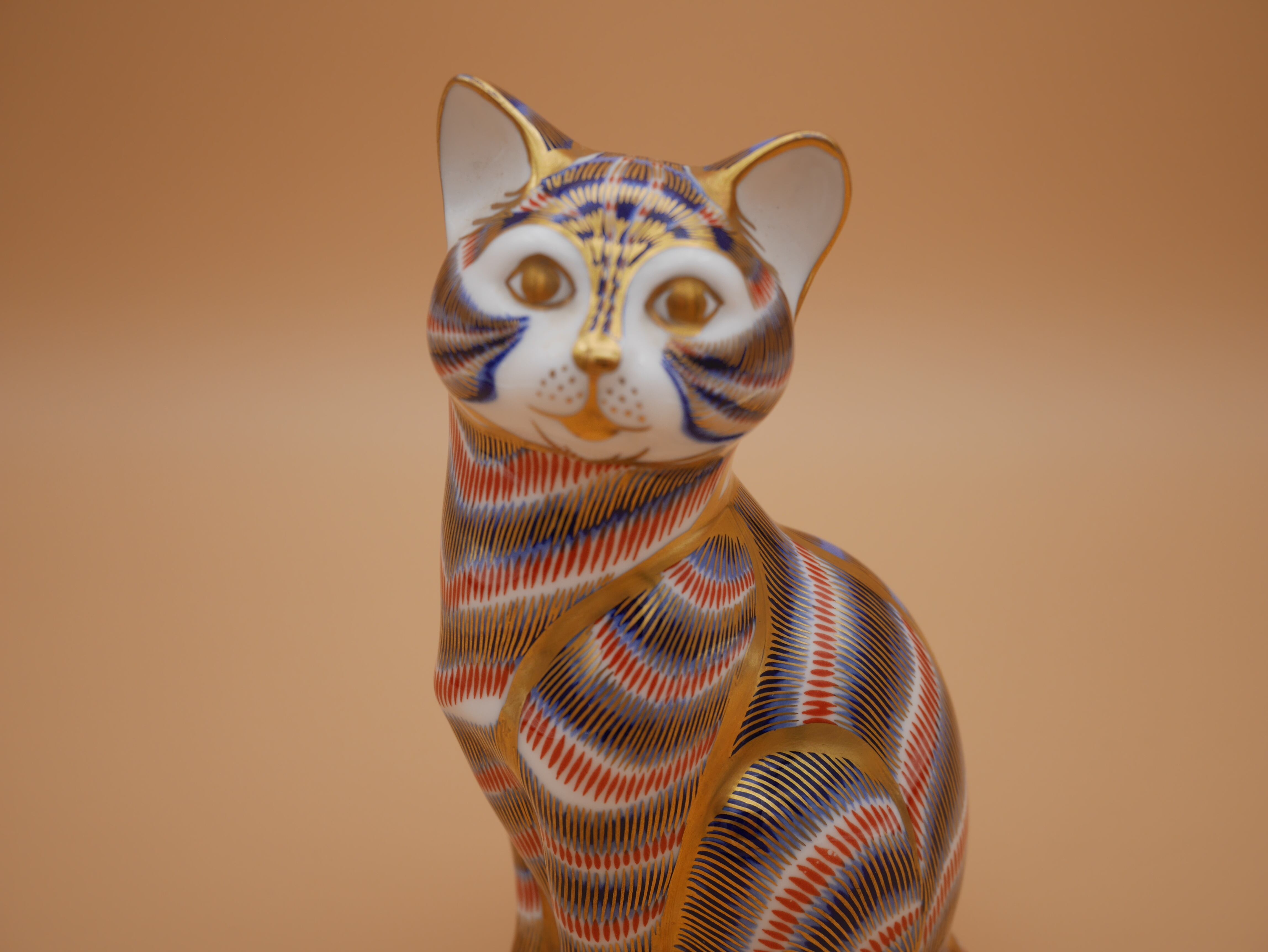 ロイヤルクラウンダービーのイマリスタイルを纏った猫のフィギュアです。美しい色合いと繊細な装飾が施され、どんなインテリアにも華やかさを添えてくれます。
