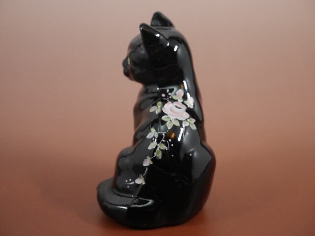 "Black Fenton" と呼ばれる黒いガラスに、バラの花がハンドペイントされています。