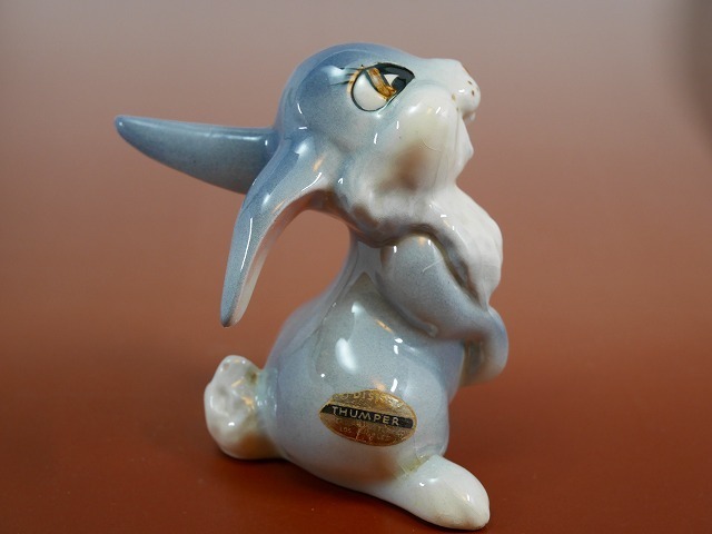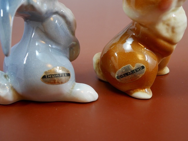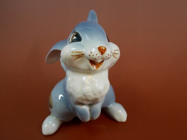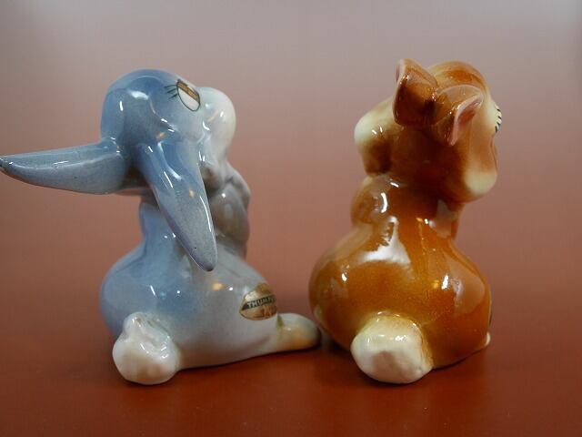 ディズニー映画、バンビのウサギ、とんすけとミスバニーの陶器製フィギュア。 1940~1950年代に作られました。 全体的に小さな傷が見受けられますが、大きなカケ、はありません。 オリジナルシールが残っています。 セット販売です。 大きさ 2体とも 約10×8×高さ12cm アメリカンポタリー社製 1940~1950年
