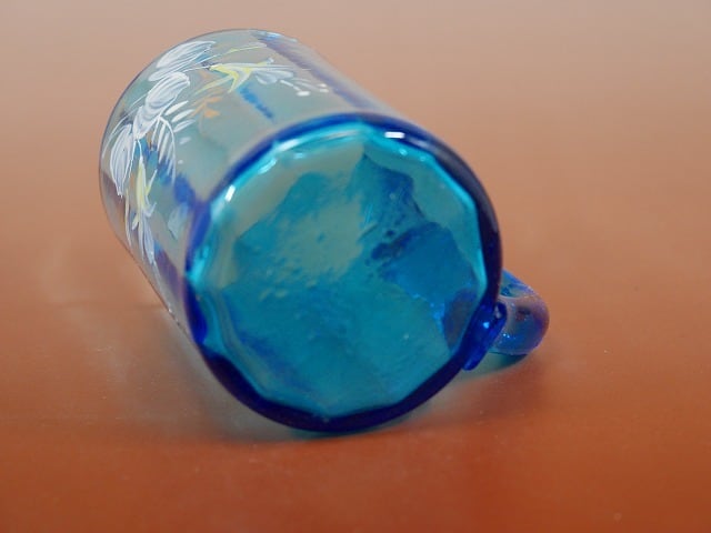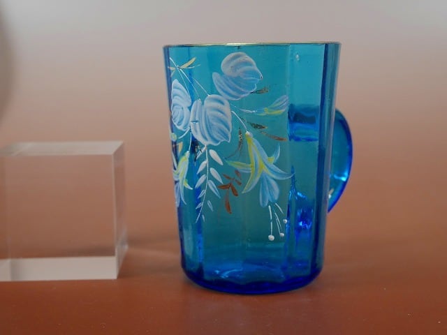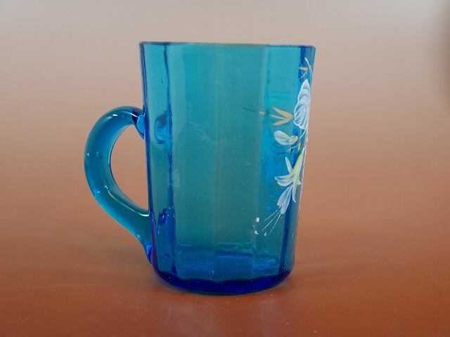 青いガラスのマグカップにエナメルでホクシャが描かれています。 口元の金が薄くなっていますが、大きなカケや割れはありません。 優しく上品な印象のガラスのマグカップです。 大きさ それぞれ約 口径7×高さ10cm 製造年 1890年ごろ 製造国 不明(イギリスもしくはチェコ)